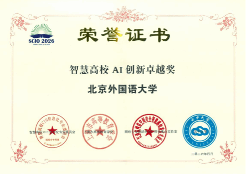 该奖项由智慧高校 CIO 信息化专业委员会、上海市高等教育学会等权威机构联合评定,重点表彰智慧校园建设及 AI 技术应用创新成效突出的标杆院校。此次获奖,标志着北外在“AI + 教育”领域的实践探索获得业界高度认可。2025年我校“人工智能+赋能,重构外语教学新生态”案例入选教育部第三批“人工智能+高等教育”应用场景典型案例,案例成果在国家高等教育智慧教育平台发布。
