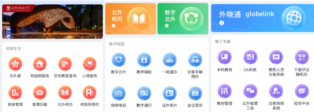 为进一步提升校园信息化服务水平,信息技术中心将对企业微信工作台进行界面与图标的优化升级。优化完成后,工作台界面将按照教师、学生、留学生不同身份分别展示相应应用,部分界面如下图所示。